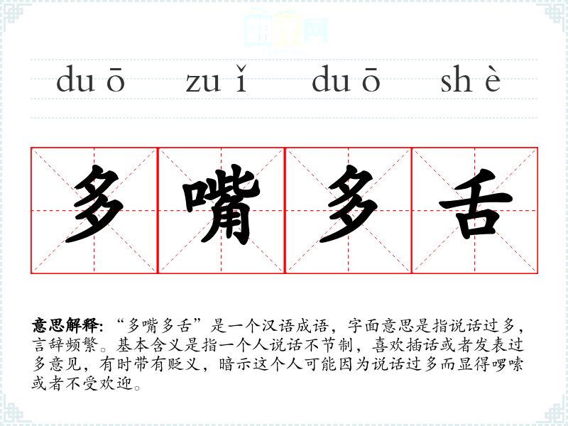 “多嘴多舌”是一个汉语成语,字面意思是指说话过多,言辞频繁。基本含义是指一个人说话不节制,喜欢插话或者发表过多意见,有时带有贬义,暗示这个人可能因为说话过多而显得啰嗦或者不受欢迎。