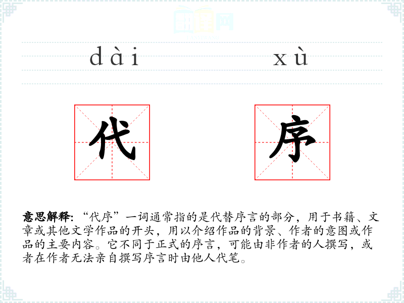 “代序”一词通常指的是代替序言的部分,用于书籍、文章或其他文学作品的开头,用以介绍作品的背景、作者的意图或作品的主要内容。它不同于正式的序言,可能由非作者的人撰写,或者在作者无法亲自撰写序言时由他人代笔。