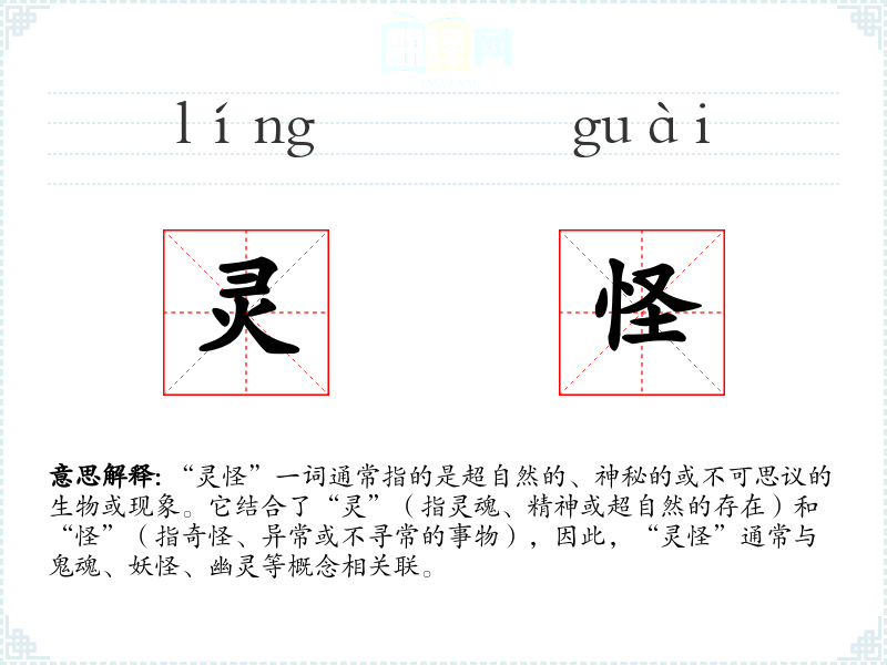 “灵怪”一词通常指的是超自然的、神秘的或不可思议的生物或现象。它结合了“灵”(指灵魂、精神或超自然的存在)和“怪”(指奇怪、异常或不寻常的事物),因此,“灵怪”通常与鬼魂、妖怪、幽灵等概念相关联。