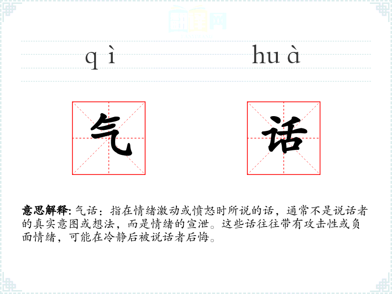 气话:指在情绪激动或愤怒时所说的话,通常不是说话者的真实意图或想法,而是情绪的宣泄。这些话往往带有攻击性或负面情绪,可能在冷静后被说话者后悔。