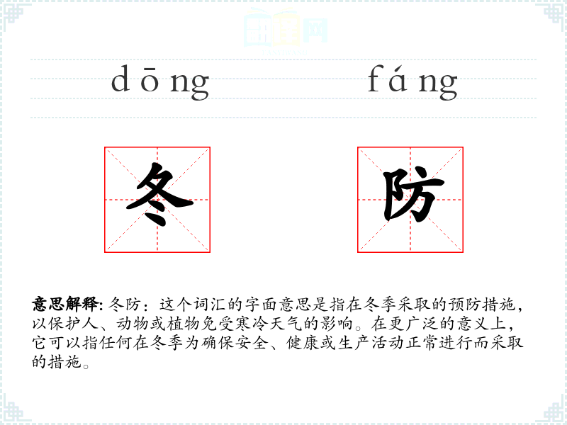 冬防:这个词汇的字面意思是指在冬季采取的预防措施,以保护人、动物或植物免受寒冷天气的影响。在更广泛的意义上,它可以指任何在冬季为确保安全、健康或生产活动正常进行而采取的措施。