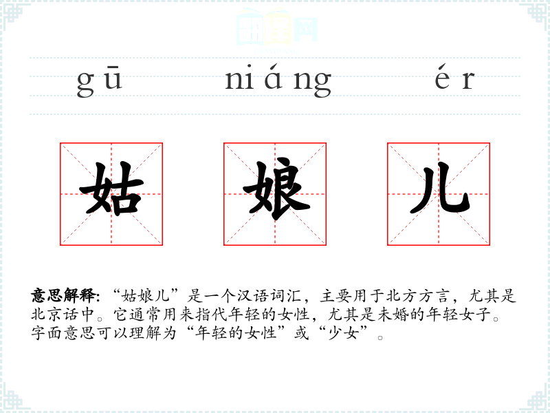 “姑娘儿”是一个汉语词汇,主要用于北方方言,尤其是北京话中。它通常用来指代年轻的女性,尤其是未婚的年轻女子。字面意思可以理解为“年轻的女性”或“少女”。