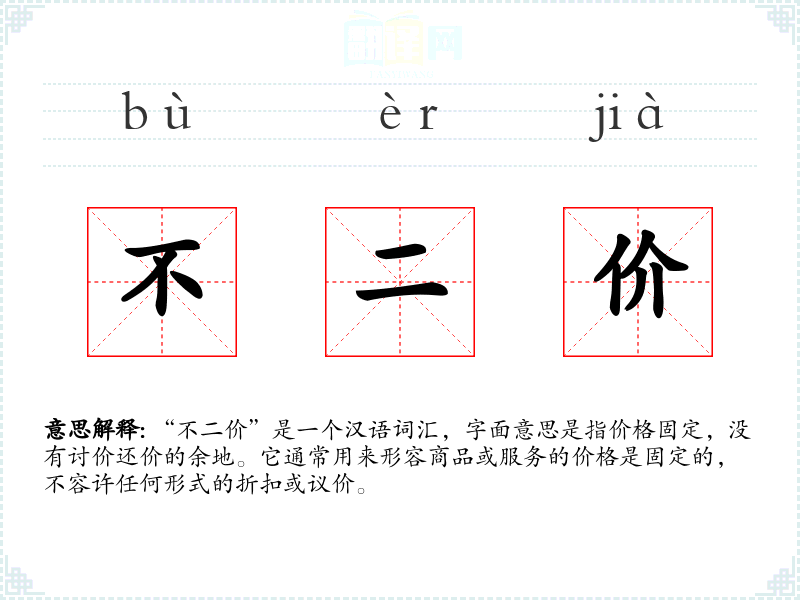 结合图片,可以想象一家古朴的店铺,门口挂着“不二价”的牌子,给人一种传统和诚信的感觉。在听觉上,这个词可能让人联想到商家坚定而诚恳的声音。