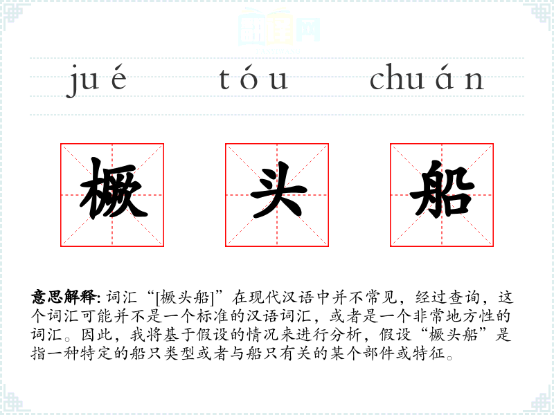 由于“橛头船”不是一个常见的词汇,对其的理解和应用可能更多地依赖于个人的想象和创造力。在语言学习和表达中,了解和掌握这样的词汇可以增加语言的丰富性和表达的多样性。
