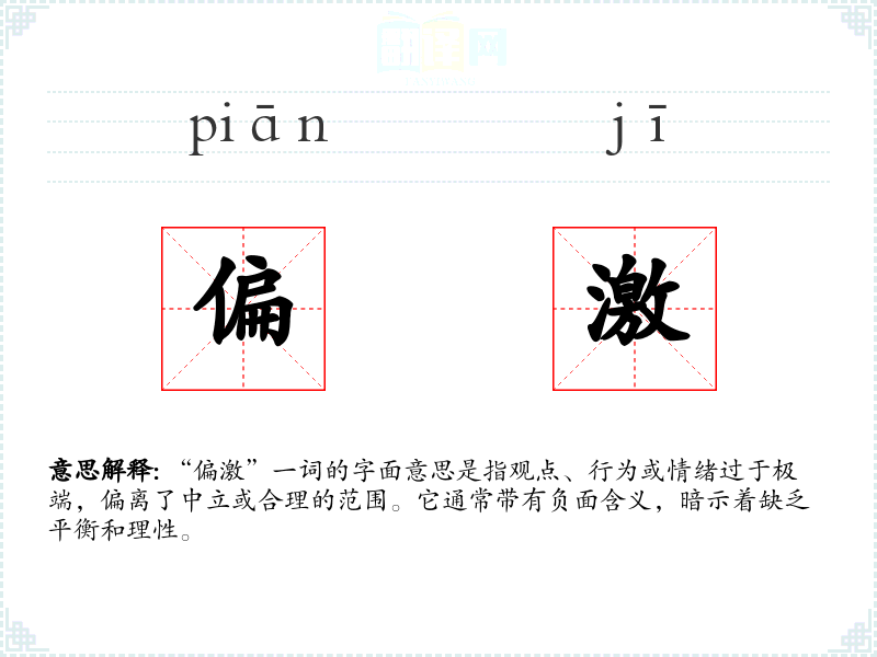 “偏激”一词的字面意思是指观点、行为或情绪过于极端,偏离了中立或合理的范围。它通常带有负面含义,暗示着缺乏平衡和理性。