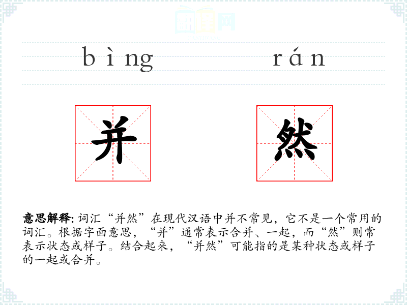 词汇“并然”在现代汉语中并不常见,它不是一个常用的词汇。根据字面意思,“并”通常表示合并、一起,而“然”则常表示状态或样子。结合起来,“并然”可能指的是某种状态或样子的一起或合并。