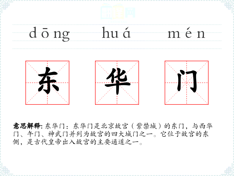 - 反义词:西华门(故宫的西门,与东华门相对)