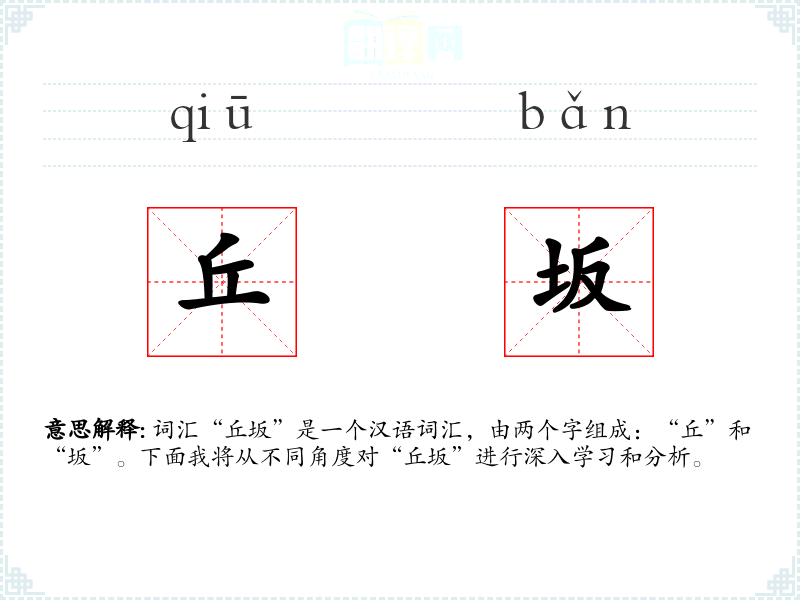 - 基本含义:结合起来,“丘坂”可以理解为山坡或斜坡上的小山。