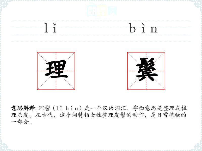 理髻(lǐ bìn)是一个汉语词汇,字面意思是整理或梳理头发。在古代,这个词特指女性整理发髻的动作,是日常梳妆的一部分。