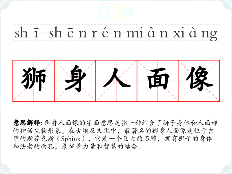 狮身人面像的字面意思是指一种结合了狮子身体和人面部的神话生物形象。在古埃及文化中,最著名的狮身人面像是位于吉萨的斯芬克斯(Sphinx),它是一个巨大的石雕,拥有狮子的身体和法老的面孔,象征着力量和智慧的结合。