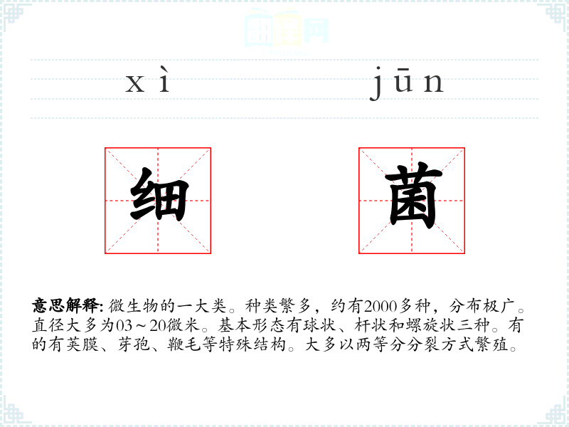 微生物的一大类。种类繁多,约有2000多种,分布极广。直径大多为03~20微米。基本形态有球状、杆状和螺旋状三种。有的有荚膜、芽孢、鞭毛等特殊结构。大多以两等分分裂方式繁殖。