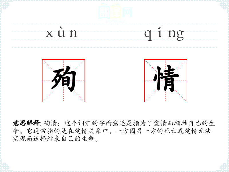 殉情:这个词汇的字面意思是指为了爱情而牺牲自己的生命。它通常指的是在爱情关系中,一方因另一方的死亡或爱情无法实现而选择结束自己的生命。