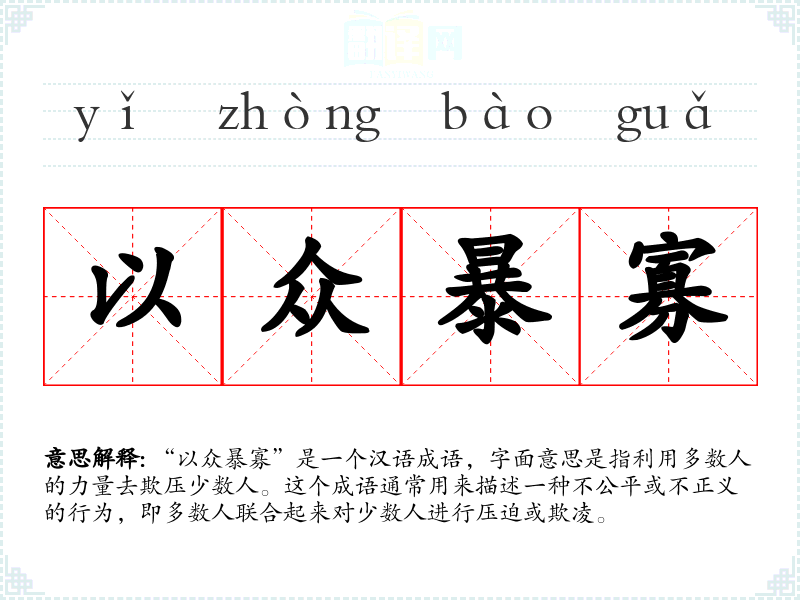 在英语中,类似的表达可能是“mobbing”或“bullying by the majority”,但这些表达不如“以众暴寡”那样简洁且富有文化内涵。