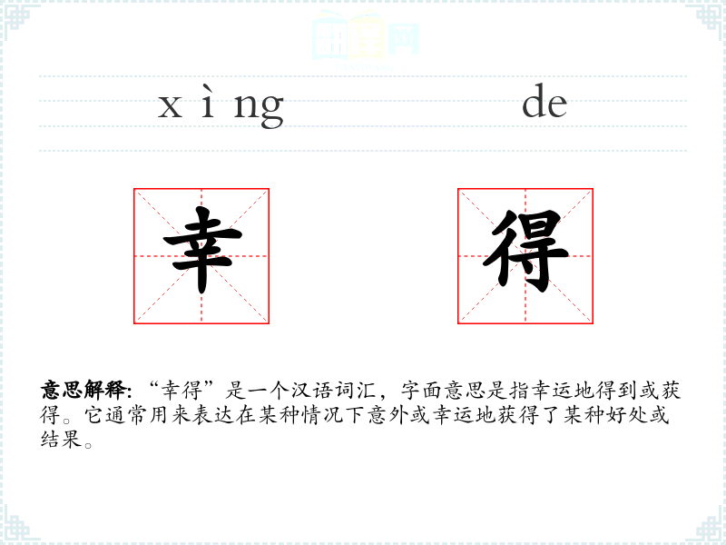 “幸得”是一个汉语词汇,字面意思是指幸运地得到或获得。它通常用来表达在某种情况下意外或幸运地获得了某种好处或结果。