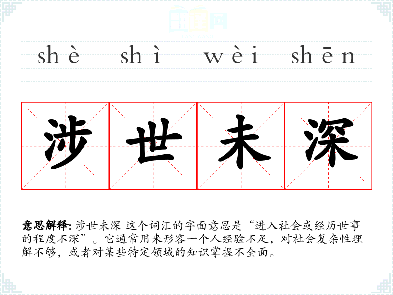 涉世未深 这个词汇的字面意思是“进入社会或经历世事的程度不深”。它通常用来形容一个人经验不足,对社会复杂性理解不够,或者对某些特定领域的知识掌握不全面。