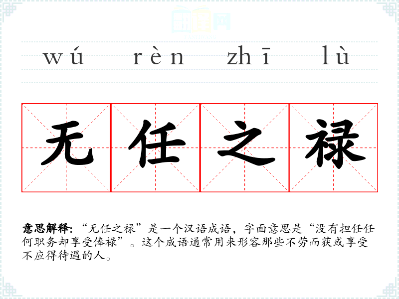 “无任之禄”是一个汉语成语,字面意思是“没有担任任何职务却享受俸禄”。这个成语通常用来形容那些不劳而获或享受不应得待遇的人。
