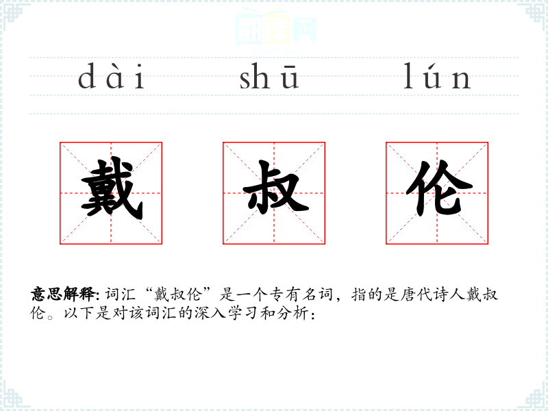 词汇“戴叔伦”是一个专有名词,指的是唐代诗人戴叔伦。以下是对该词汇的深入学*和分析: