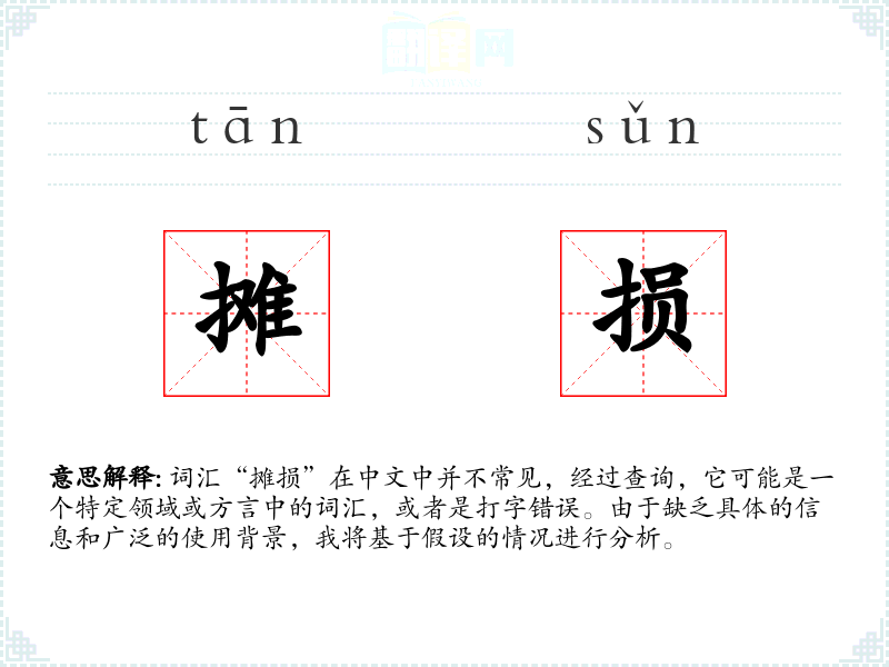 词汇“摊损”在中文中并不常见,经过查询,它可能是一个特定领域或方言中的词汇,或者是打字错误。由于缺乏具体的信息和广泛的使用背景,我将基于假设的情况进行分析。