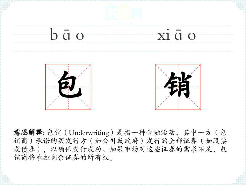 包销(Underwriting)是指一种金融活动,其中一方(包销商)承诺购买发行方(如公司或政府)发行的全部证券(如股票或债券),以确保发行成功。如果市场对这些证券的需求不足,包销商将承担剩余证券的所有权。
