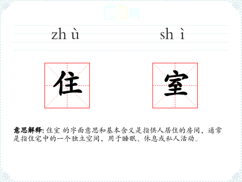 住室 的字面意思和基本含义是指供人居住的房间,通常是指住宅中的一个独立空间,用于睡眠、休息或私人活动。