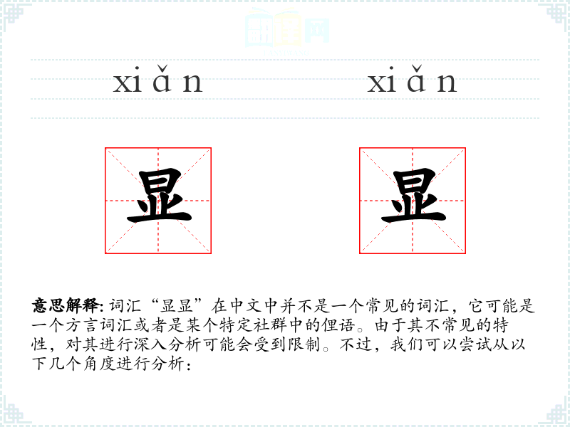 由于“显显”不是一个标准的中文词汇,我们无法给出一个确切的基本定义。它可能是形容词,表示“明显”或“显著”的意思,也可能是动词,表示“显现”或“展示”的意思。