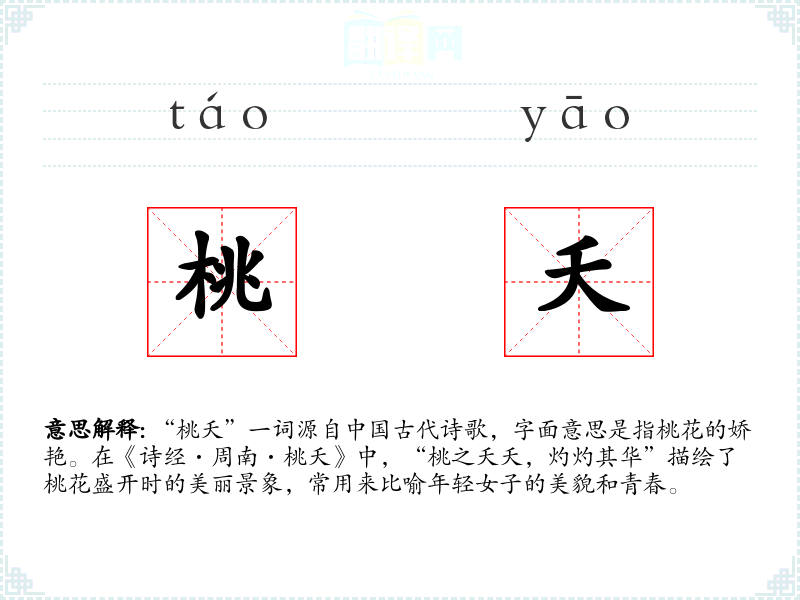 “桃夭”一词源自**古代诗歌,字面意思是指桃花的娇艳。在《诗经·周南·桃夭》中,“桃之夭夭,灼灼其华”描绘了桃花盛开时的美丽景象,常用来比喻年轻女子的美貌和青春。