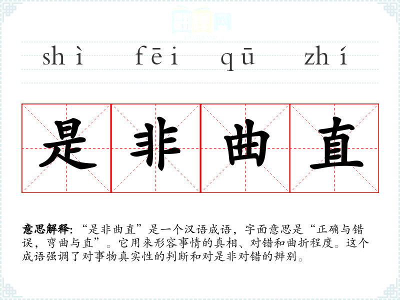 在**传统文化中,“是非曲直”与儒家思想中的“正名”和“中庸”有关,强调对事物真实性的追求和对道德标准的坚守。在现代社会,这个成语仍然被广泛用于法律、道德和公共讨论中,强调公正和真理的重要性。