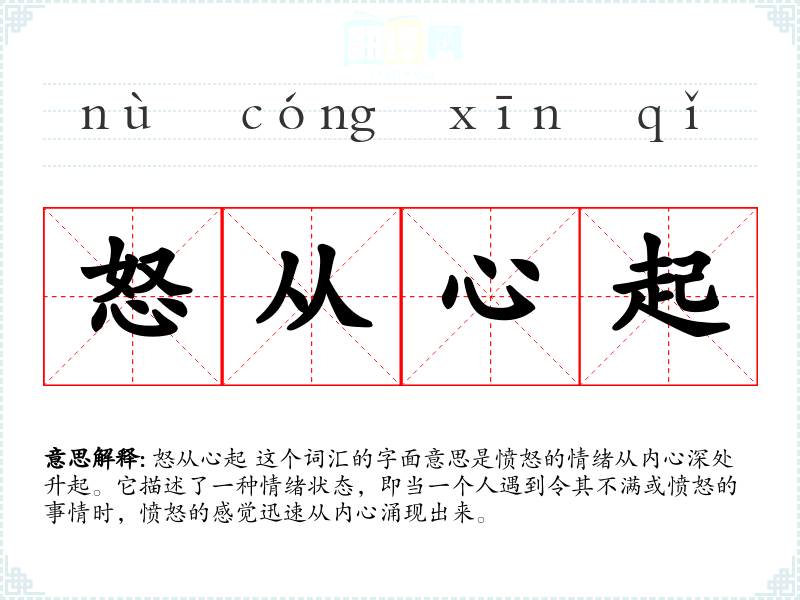 怒从心起 这个词汇的字面意思是愤怒的情绪从内心深处升起。它描述了一种情绪状态,即当一个人遇到令其不满或愤怒的事情时,愤怒的感觉迅速从内心涌现出来。