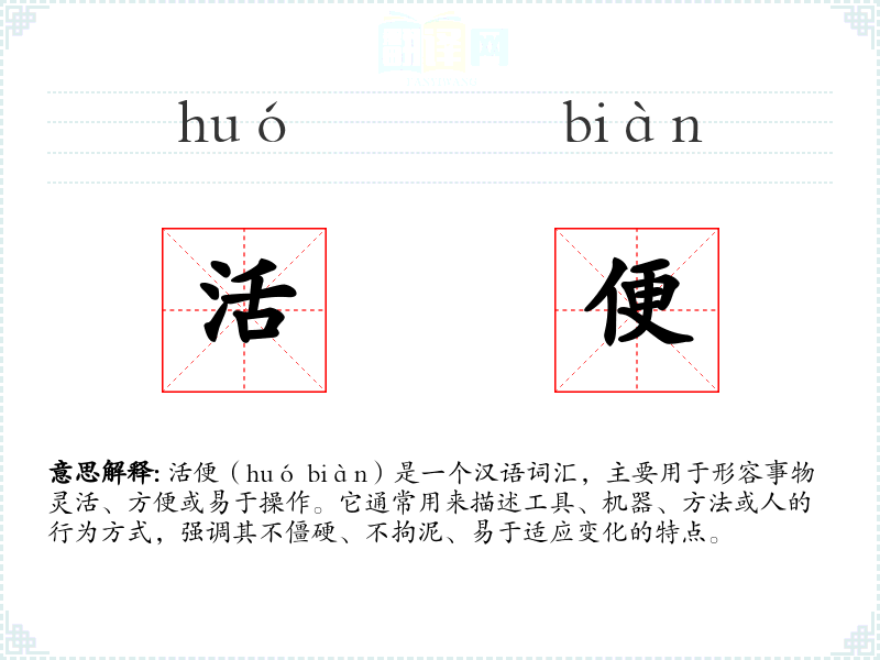 - 文学:在文学作品中,这个词可能用来形容人物的性格或行为方式,如“他做事总是很活便,从不拘泥于传统”。