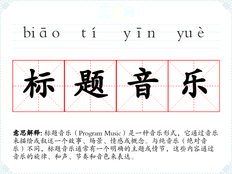 标题音乐(Program Music)是一种音乐形式,它通过音乐来描绘或叙述一个故事、场景、情感或概念。与纯音乐(绝对音乐)不同,标题音乐通常有一个明确的主题或情节,这些内容通过音乐的旋律、和声、节奏和音色来表达。