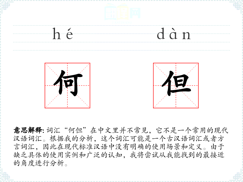 由于“何但”在现代汉语中不常用,我无法提供一个确切的基本定义。它可能是由“何”(什么)和“但”(仅仅)两个字组成的短语,但在现代汉语中并没有这样的组合用法。
