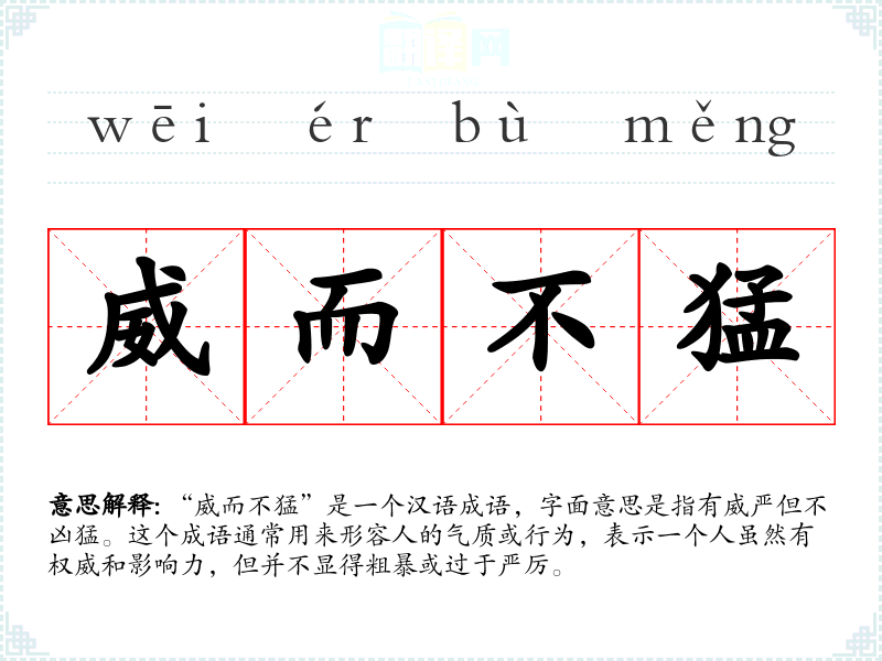 “威而不猛”是一个汉语成语,字面意思是指有威严但不凶猛。这个成语通常用来形容人的气质或行为,表示一个人虽然有权威和影响力,但并不显得粗暴或过于严厉。