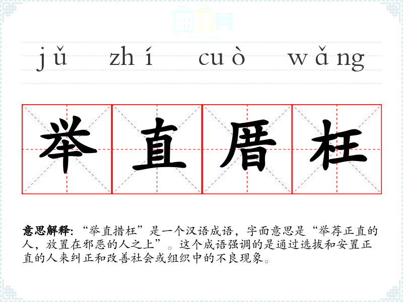 “举直措枉”是一个汉语成语,字面意思是“举荐正直的人,放置在邪恶的人之上”。这个成语强调的是通过选拔和安置正直的人来纠正和改善社会或组织中的不良现象。