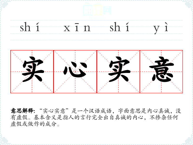 “实心实意”是一个汉语成语,字面意思是内心真诚,没有虚假。基本含义是指人的言行完全出自真诚的内心,不掺杂任何虚假或做作的成分。