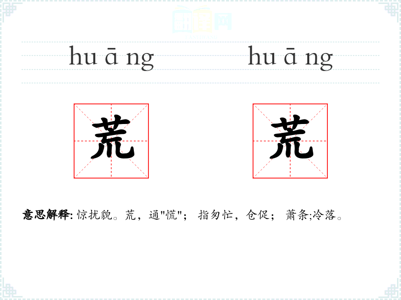 惊扰貌。荒,通"慌"; 指匆忙,仓促; 萧条;冷落。