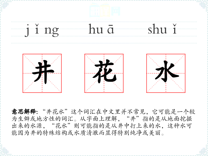 “井花水”这个词汇在中文里并不常见,它可能是一个较为生僻或地方性的词汇。从字面上理解,“井”指的是从地面挖掘出来的水源,“花水”则可能指的是从井中打上来的水,这种水可能因为井的特殊结构或水质清澈而显得特别纯净或美丽。