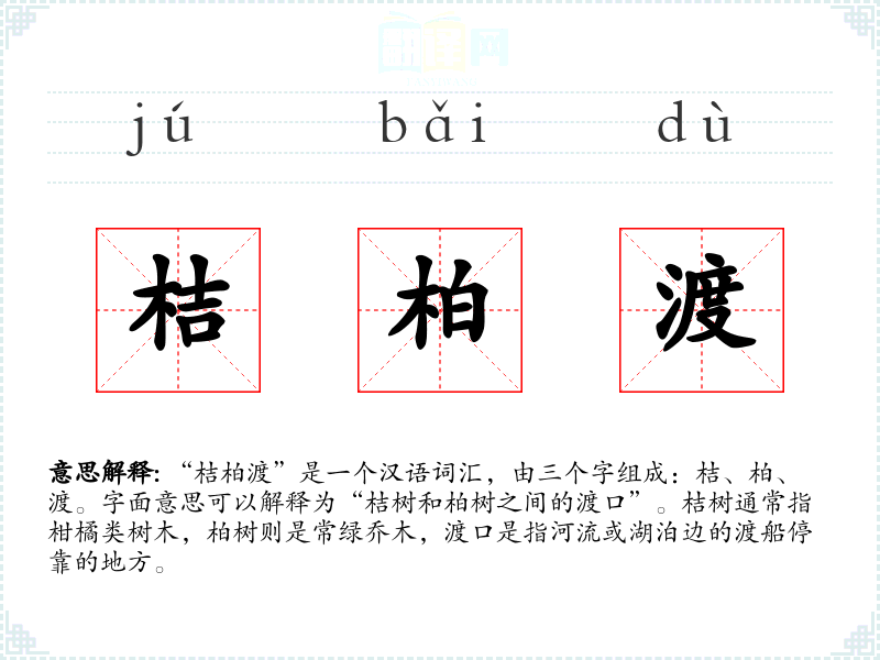 “桔柏渡”是一个汉语词汇,由三个字组成:桔、柏、渡。字面意思可以解释为“桔树和柏树之间的渡口”。桔树通常指柑橘类树木,柏树则是常绿乔木,渡口是指河流或湖泊边的渡船停靠的地方。