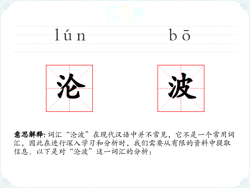 词汇“沦波”在现代汉语中并不常见,它不是一个常用词汇,因此在进行深入学习和分析时,我们需要从有限的资料中提取信息。以下是对“沦波”这一词汇的分析: