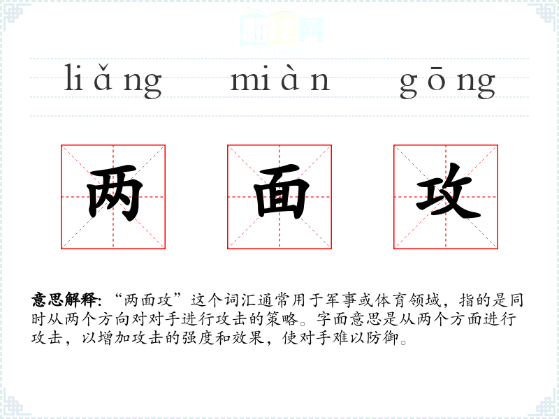 “两面攻”这个词汇通常用于军事或体育领域,指的是同时从两个方向对对手进行攻击的策略。字面意思是从两个方面进行攻击,以增加攻击的强度和效果,使对手难以防御。