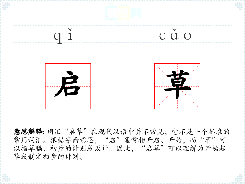 词汇“启草”在现代汉语中并不常见,它不是一个标准的常用词汇。根据字面意思,“启”通常指开启、开始,而“草”可以指草稿、初步的计划或设计。因此,“启草”可以理解为开始起草或制定初步的计划。
