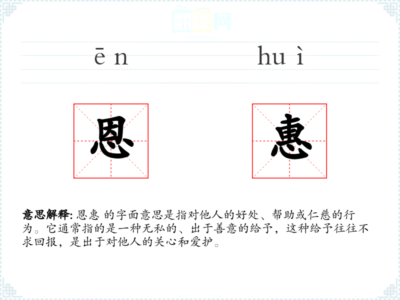 恩惠 的字面意思是指对他人的好处、帮助或仁慈的行为。它通常指的是一种无私的、出于善意的给予,这种给予往往不求回报,是出于对他人的关心和爱护。