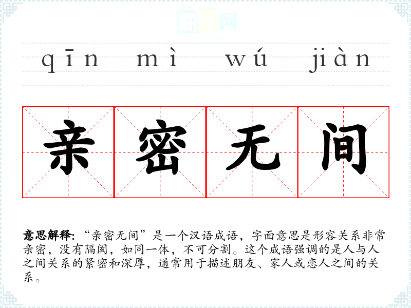 - 文学语境:在文学作品中,“亲密无间”常用来描绘人物之间深厚的情感纽带,如《红楼梦》中贾宝玉和林黛玉的关系。