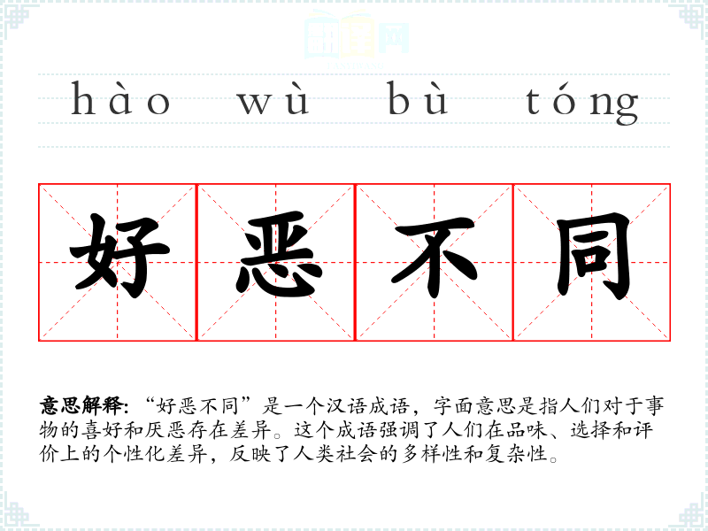“好恶不同”这个成语提醒我们在交流和决策中要考虑到个体差异,尊重他人的选择和偏好。在语言学*和表达中,理解和运用这个成语有助于我们更好地与他人沟通和协作。
