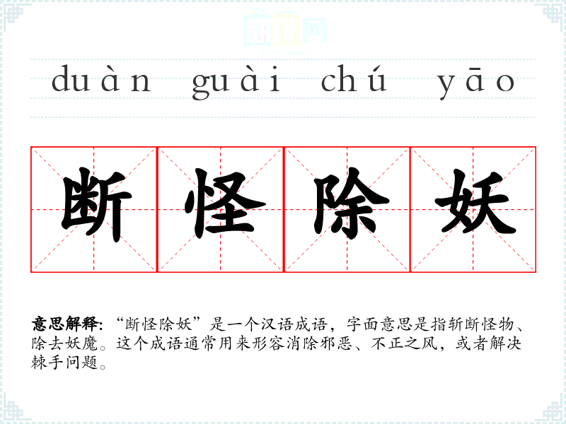 “断怪除妖”是一个汉语成语,字面意思是指斩断怪物、除去妖魔。这个成语通常用来形容消除邪恶、不正之风,或者解决棘手问题。