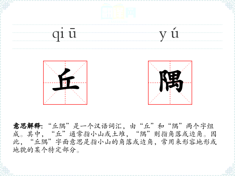 在英语中,类似的表达可能是“hillside nook”或“mountain corner”,虽然也能传达出类似的意思,但“丘隅”这个词在中文中所蕴含的文化和情感意义更为丰富。