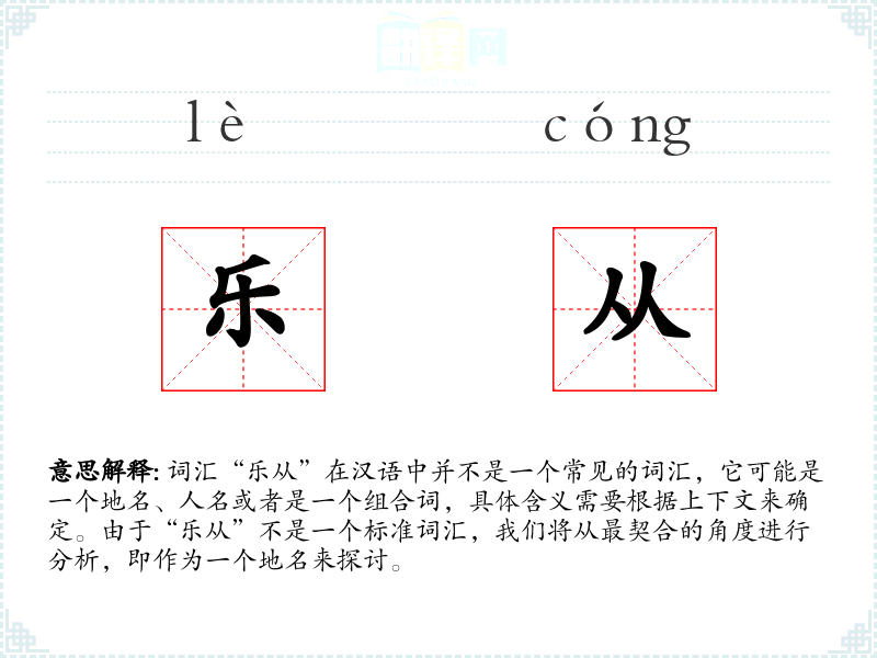 由于“乐从”是一个特定地名,其在不同语言或文化中的对应词汇可能就是其汉语拼音“Lècóng”。