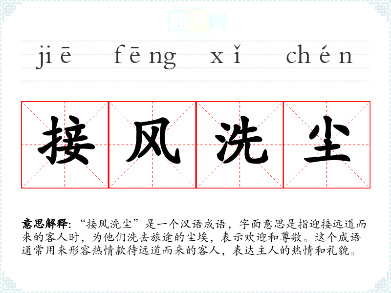“接风洗尘”是一个汉语成语,字面意思是指迎接远道而来的客人时,为他们洗去旅途的尘埃,表示欢迎和尊敬。这个成语通常用来形容热情款待远道而来的客人,表达主人的热情和礼貌。