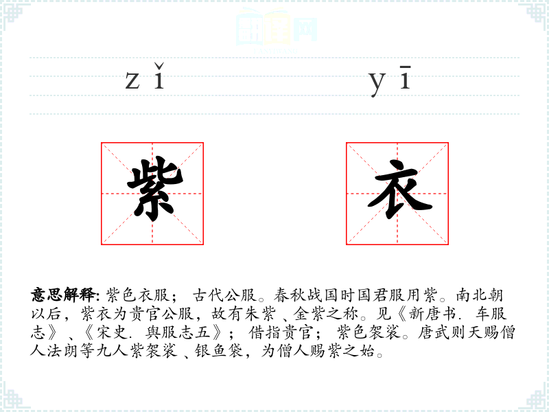 1.紫色衣服; 古代公服。春秋战国时国君服用紫。南北朝以后,紫衣为贵官公服,故有朱紫﹑金紫之称。见《新唐书.车服志》﹑《宋史.舆服志五》; 借指贵官; 紫色袈裟。唐武则天赐僧人法朗等九人紫袈裟﹑银鱼袋,为僧人赐紫之始。