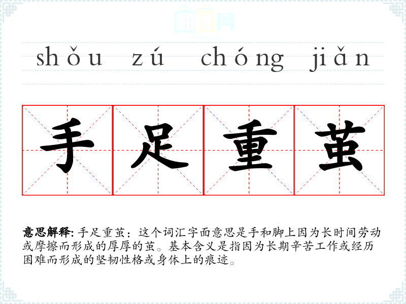 手足重茧:这个词汇字面意思是手和脚上因为长时间劳动或摩擦而形成的厚厚的茧。基本含义是指因为长期辛苦工作或经历困难而形成的坚韧性格或身体上的痕迹。