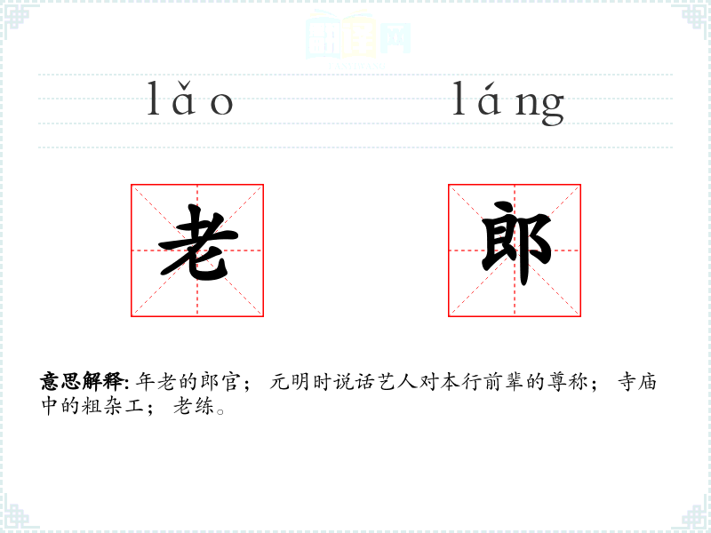 年老的郎官; 元明时说话艺人对本行前辈的尊称; 寺庙中的粗杂工; 老练。